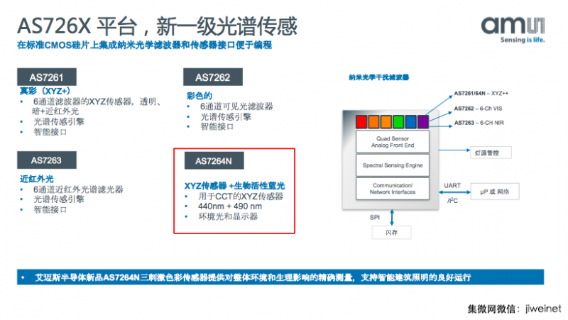 此次,艾邁斯半導(dǎo)體高管團隊中國行,主要發(fā)布的產(chǎn)品就屬于光學(xué)領(lǐng)域——一顆三刺激傳感器AS7264N。據(jù)悉,AS7264N可以提供的顏色測量,可精準(zhǔn)匹配人眼對可視光譜的反應(yīng),還能精確地測量藍光波長。