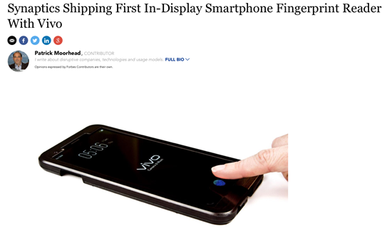 在一則福布斯Forbes的新聞報(bào)道中,正式公布Synaptics與vivo聯(lián)手推出首款屏幕指紋傳感器。并且在報(bào)道中唯一一張圖片就是實(shí)現(xiàn)了屏幕指紋識(shí)別的vivo新機(jī),意味著vivo將會(huì)首發(fā)這一技術(shù)。