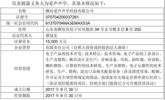 12月29日晚間,共達電聲再度公布交易方愛聲聲學信息,資料顯示,愛聲聲學成立于2017年9月30日,注冊資金為1.5億元,法定代表人為謝冠宏,公司主要從事聲學器件研發(fā)和生產(chǎn)!