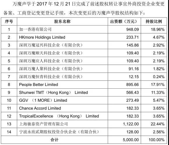 值得注意的是,愛聲聲學實際上就是萬魔聲學旗下100%控股子公司!而萬魔聲學的前身為加一聯(lián)創(chuàng)電子科技有限公司。加一聯(lián)創(chuàng)為加一香港于2013年10月設立的外商獨資企業(yè),注冊資本為5000 萬元,加一香港持有加一聯(lián)創(chuàng) 100%股權(quán)。2015 年 11 月,加一聯(lián)創(chuàng)企業(yè)名稱變更為“萬魔聲學科技有限公司”。
