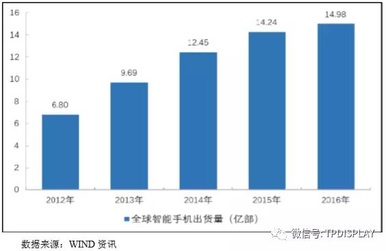 根據(jù)WIND資訊和GartnerGroup統(tǒng)計(jì)數(shù)據(jù),2016年全球智能手機(jī)出貨量為14.98億部,2012-2016年復(fù)合增長(zhǎng)率約為21.83%4。2013年開(kāi)始,全球手機(jī)市場(chǎng)呈現(xiàn)突破式發(fā)展,智能手機(jī)逐漸取代傳統(tǒng)手機(jī)成為人們主流的日常電子消費(fèi)品,智能手機(jī)增量實(shí)現(xiàn)近半數(shù)增長(zhǎng)。隨著包括歐美發(fā)達(dá)國(guó)家、中國(guó)大陸等地區(qū)的手機(jī)保有量增速日近飽和,2014年開(kāi)始智能手機(jī)市場(chǎng)需求增速逐漸減緩。2012-2016年,全球智能手機(jī)出貨量情況如下圖所示: