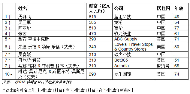 前十中一半來自中國,周群飛成為全球白手起家女首富。3人新進(jìn)前十:美國最大屋頂與墻面批發(fā)分銷商ABC Supply的戴安·亨德里克斯、“手機喇叭女王”瑞聲科技的吳春媛,以及英國在線博彩公司Bet365的丹尼斯·科茨。