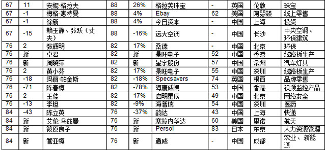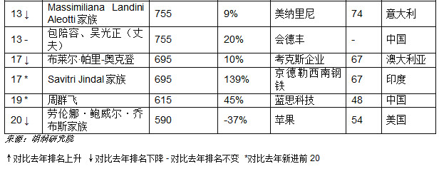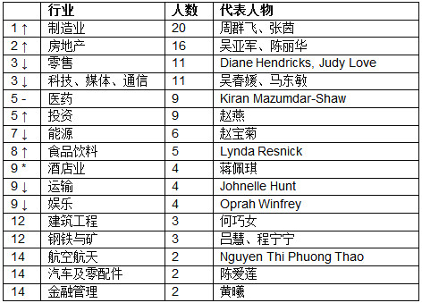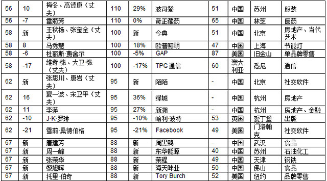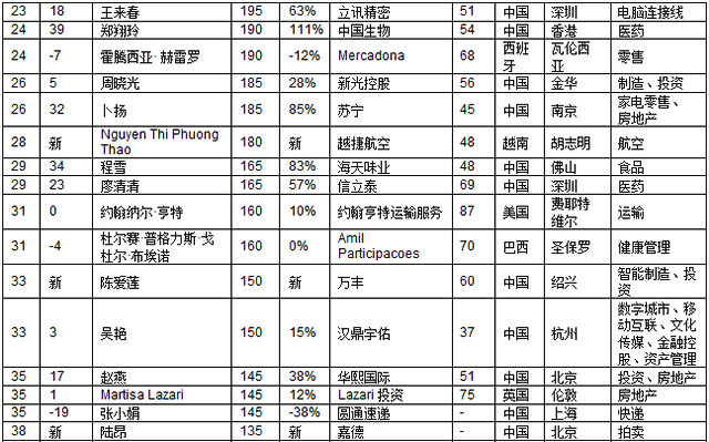 碧桂園楊國強家族的楊美容憑借博實樂以財富115億元新上榜,博實樂已經(jīng)成為全球三大教育集團(tuán)之一。在中國也頗具知名度的時尚品牌Tory Burch的創(chuàng)始人以財富88億元新上榜,珠寶品牌潘多拉的丹麥聯(lián)合創(chuàng)始人溫妮·埃內(nèi)弗德森財富63億元。印度唯一一位上榜的白手起家女企業(yè)家KiranMazumdar-Shaw財富上漲88%,達(dá)到245億元。