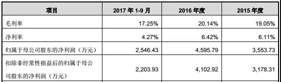 在盈利方面,如上表所示,元盛電子2015至2016年基本維持在穩(wěn)中有進(jìn)的水平,但是2017年前三季度,凈利潤下降幅度就較大了,這主要是因?yàn)?017年前三季度毛利率下降所致,其中雙面板毛利率相較于2016年度,下降了4.09%。