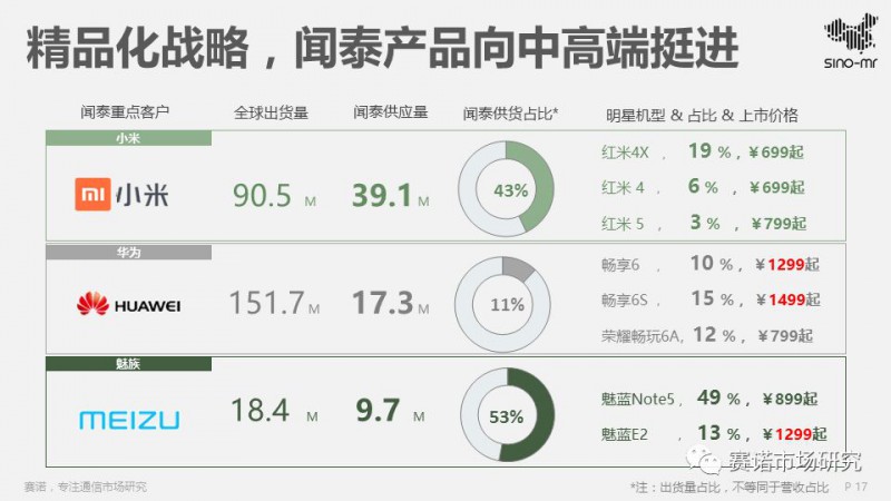 從競(jìng)爭(zhēng)力看,聞泰精品化、規(guī)?;?yīng)明顯。聞泰客戶(hù)結(jié)構(gòu)健康、產(chǎn)品上新速度和銷(xiāo)量均有亮眼表現(xiàn)。全面出貨千萬(wàn)臺(tái)機(jī)型有3款、百萬(wàn)有11款。超過(guò)1000元的熱銷(xiāo)機(jī)型有6款。?