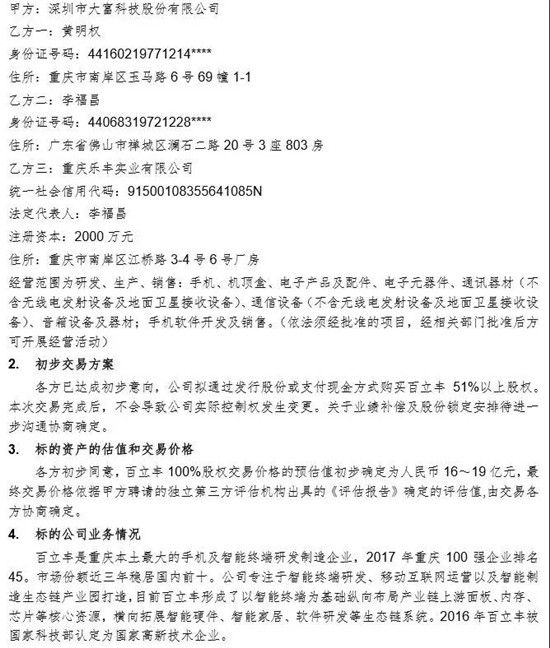 大富科技,一家2014年才進(jìn)入手機(jī)產(chǎn)業(yè)的上市公司,早在2017年9月,起就曾發(fā)布公告表示,公司擬作價(jià)25.4億元收購精密結(jié)構(gòu)件廠商湘將鑫,而湘將鑫則是金立、傳音、聞泰供應(yīng)商,不曾料想,這筆收購最終以流產(chǎn)告終,然而,對(duì)于急需轉(zhuǎn)型的大富科技而言,收購之路并未就此終止,日前,其再次發(fā)布公告表示,公司擬以11-16億元的價(jià)格收購百立豐51%股權(quán)!