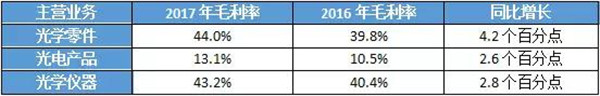 其中,光學(xué)零件事業(yè)的毛利率約為44.0%,較2016年的約39.8%上升了4.2個百分點(diǎn);光電產(chǎn)品事業(yè)的毛利率約為13.1%,較2016年的約10.5%上升了2.6個百分點(diǎn);光學(xué)儀器事業(yè)的毛利率約為43.2%,較2016年的約40.4%上升了2.8個百分點(diǎn)。