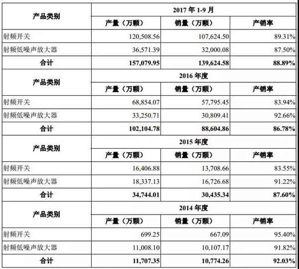 從售價(jià)方面來看,2014年度、2015年度、2016年度和2017年1-9月,本公司主要產(chǎn)品射頻開關(guān)平均單價(jià)分別為0.2595元/顆、0.4089元/顆、0.4619元/顆和0.3494元/顆;射頻低噪聲放大器的平均單價(jià)分別為0.2967元/顆、0.2519元/顆、0.3474元/顆和0.2915元/顆。