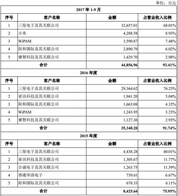 而從客戶群體來看的話,報(bào)告期內(nèi)三星作為卓勝微電子第一大客戶,2014年度、2015年度、2016年度和2017年1-9月份貢獻(xiàn)了公司整體收入的31.25%、40.01%、76.23%和68.01%。由此可見,其對(duì)三星的業(yè)務(wù)依賴相當(dāng)之重!其射頻前端芯片產(chǎn)品應(yīng)用于三星(直銷)、小米(直銷)、華為、聯(lián)想、魅族、TCL等終端廠商的產(chǎn)品。