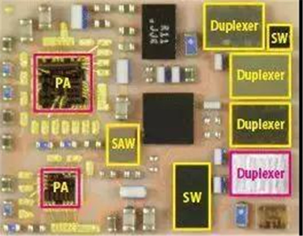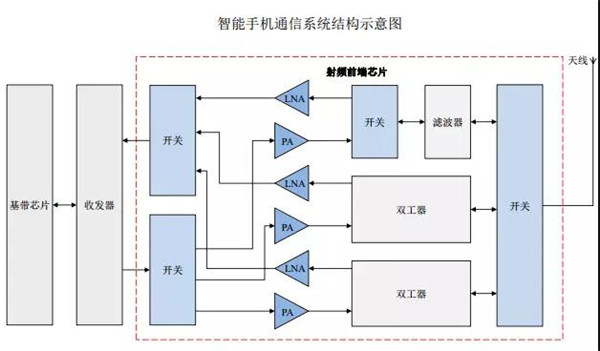 眾所周知,射頻前端芯片包括射頻開關(guān)、射頻低噪聲放大器、射頻功率放大器、雙工器、射頻濾波器等芯片。射頻開關(guān)用于實(shí)現(xiàn)射頻信號(hào)接收與發(fā)射的切換、不同頻段間的切換;射頻低噪聲放大器用于實(shí)現(xiàn)接收通道的射頻信號(hào)放大;射頻功率放大器用于實(shí)現(xiàn)發(fā)射通道的射頻信號(hào)放大;射頻濾波器用于保留特定頻段內(nèi)的信號(hào),而將特定頻段外的信號(hào)濾除;雙工器用于將發(fā)射和接收信號(hào)的隔離,保證接收和發(fā)射在共用同一天線的情況下能正常工作。