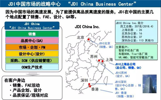 為了能應(yīng)對(duì)中國(guó)市場(chǎng)的高速發(fā)展,提供高速高質(zhì)的服務(wù),JDI在中國(guó)的北京、上海、蘇州、深圳等地配置了銷售、FAE、設(shè)計(jì)、QA等部門。中國(guó)市場(chǎng)儼然成為JDI的重點(diǎn)布局。主要客戶為各家智能手機(jī)廠商,各家車載OEM、Tier1廠商,以及VR、HMD、智能可穿戴廠商。