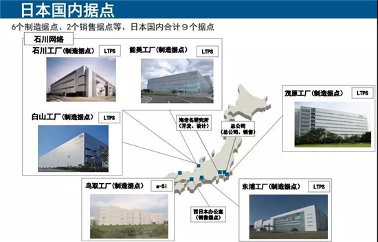 JDI在日本國(guó)內(nèi)有六家工廠,其中石川工廠為6代工廠,主要生產(chǎn)智能手機(jī)顯示屏;鳥取工廠生產(chǎn)車載面板,東浦工廠主要生產(chǎn)可穿戴設(shè)備面板。海外共有五家工廠以及六個(gè)銷售點(diǎn)。