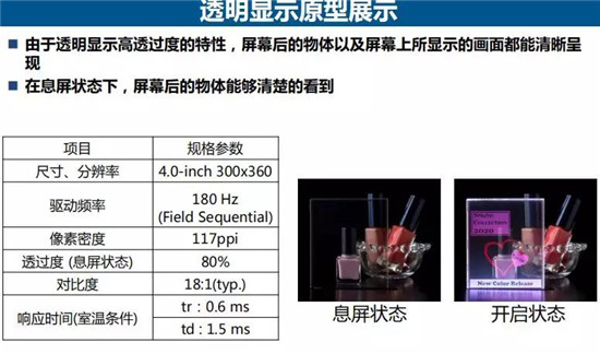 在息屏狀態(tài)下,我們的透過率達(dá)到80%,開啟狀態(tài),既能看到畫面動(dòng)態(tài)也能看到后邊實(shí)物,該產(chǎn)品的驅(qū)動(dòng)頻率是普通產(chǎn)品的3倍以上,達(dá)到180Hz。該項(xiàng)技術(shù)可應(yīng)用于汽車前窗、鏡子表面、購物中心等櫥窗展示等都是我們構(gòu)想的未來發(fā)展方向。這些應(yīng)用領(lǐng)域主要取決于透明化的需求,JDI將致力于該領(lǐng)域不斷去開發(fā)和研究。