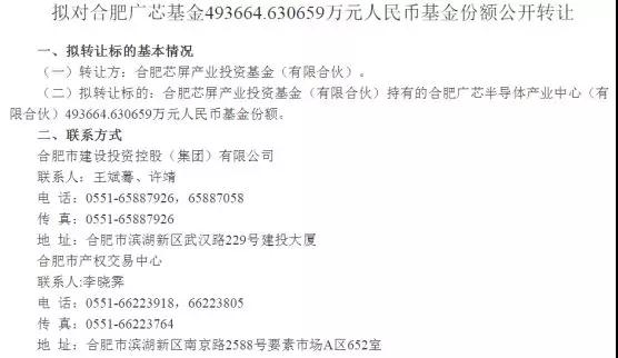 據(jù)了解,早在2018年3月2日,安徽合肥公共資源交易中心發(fā)布公告稱,擬對合肥廣芯基金493664.630659萬元人民幣(約50億元)基金份額公開轉(zhuǎn)讓。