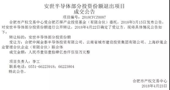 到了4月23日,據(jù)合肥市產(chǎn)權交易中心再次發(fā)布公告表示,受合肥芯屏產(chǎn)業(yè)投資基金(有限合伙)委托,2018年3月15日發(fā)布公告,對安世半導體部分投資份額進行公開轉(zhuǎn)讓,2018年4月22日確定了受讓方。受讓方為合肥中聞金泰半導體投資有限公司、云南省城市建設投資集團有限公司、上海硅胤企業(yè)管理合伙企業(yè)(有限合伙)聯(lián)合體,成交金額為114.35億元!