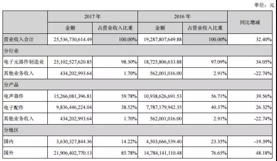 報(bào)告期內(nèi),公司主營(yíng)業(yè)務(wù)為電聲器件業(yè)務(wù)和電子配件業(yè)務(wù)。公司電聲器件業(yè)務(wù)主要產(chǎn)品為微型麥克風(fēng)、微型揚(yáng)聲器、揚(yáng)聲器模組、天線模組、有線耳機(jī)、無線耳機(jī)、MEMS傳感器及其他電子元器件等,公司電子配件業(yè)務(wù)主要為智能音響產(chǎn)品、智能家用電子游戲機(jī)配件產(chǎn)品、智能可穿戴電子產(chǎn)品、虛擬現(xiàn)實(shí)/增強(qiáng)現(xiàn)實(shí)產(chǎn)品、工業(yè)自動(dòng)化產(chǎn)品等,產(chǎn)品廣泛應(yīng)用于以智能手機(jī)、智能平板電腦、智能家用電子游戲機(jī)、智能可穿戴電子產(chǎn)品等為代表的消費(fèi)電子領(lǐng)域。
