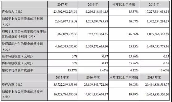 2017年藍(lán)思科技實(shí)現(xiàn)營(yíng)業(yè)收入237.02億元,較上年同期增長(zhǎng)55.57%,歸屬于上市公司股東的凈利潤(rùn)20.46億元,較上年同期增長(zhǎng)70.07%。