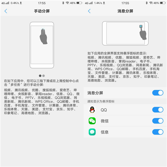 雖然這個功能早很多機型上都出現(xiàn)過,但是vivoY71做的卻非常貼心好用,在開啟功能上只需三指下滑,便可以啟動分屏模式,從此我們可以一邊看電影一邊回復消息,一邊玩游戲一邊發(fā)短信。
