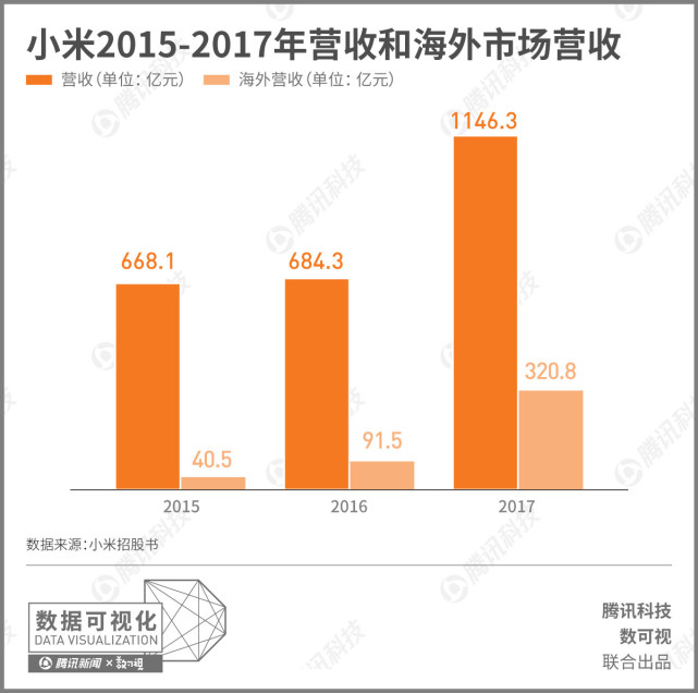 招股書披露,小米2015年至2017年收入分別為668.11億元、684.34.億元和1146.25億元,海外市場收入分別為40.5億元、91.5億元、320.8億元。