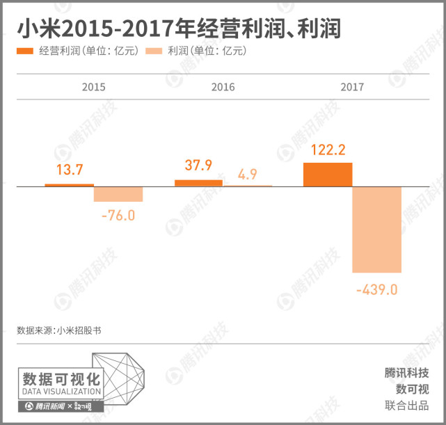 經(jīng)營利潤方面,小米2015年至2017年分別為13.73億元、37.85億元和122.15億元;利潤方面,2015年至2017年,分別為-76億元、4.9億元和-439億元。
