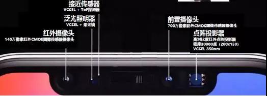 iPhone X采用的3D感測核心元件包括點陣投影器、接近傳感器和泛光照明器等。如圖1所示,iPhone X正面屏幕上方的“劉海”部分,也就是安裝3D感測系統(tǒng)與前置相機的地方,由左往右依次是NIR攝像頭傳感器、接近傳感器&泛光照明器、光譜傳感器、RGB攝像頭以及點陣投影器等。