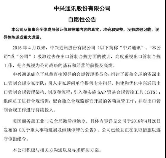 早在4月22日,中興還曾發(fā)布公告表示,2016年4月以來(lái),中興通訊股份有限公司吸取過(guò)去在出口管制合規(guī)方面的教訓(xùn),高度重視出口管制合規(guī)工作,把合規(guī)視為公司戰(zhàn)略的基石和經(jīng)營(yíng)的前提及底線。