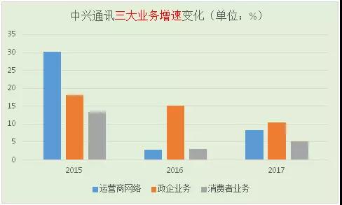由此可見(jiàn),盡管中興通訊在整體業(yè)績(jī)上表現(xiàn)十分搶眼,但是這兩年其通過(guò)處置子公司等行為獲得的收益也占了不少的成分。據(jù)筆者了解到,中興通訊從2015年開(kāi)始在財(cái)務(wù)報(bào)表上采用現(xiàn)有三大主營(yíng)業(yè)務(wù)統(tǒng)計(jì)方式,分別是運(yùn)營(yíng)商網(wǎng)絡(luò)、政企業(yè)務(wù)以及消費(fèi)者業(yè)務(wù)。