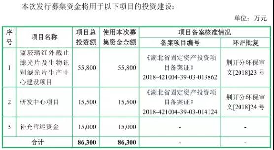 從募資情況來看,此次總計(jì)募集資金8.63億元,其中5.58億元用于藍(lán)玻璃紅外截止濾光片及生物識(shí)別濾光片生產(chǎn)中心建設(shè)項(xiàng)目,另外1.55億元用于研發(fā)中心項(xiàng)目,剩余的1.5億元用于補(bǔ)充運(yùn)營資金!