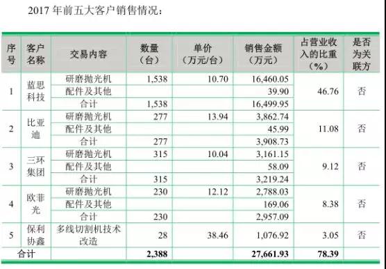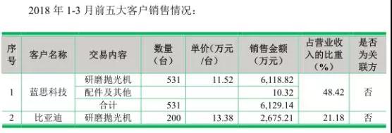 2015年以來,公司開發(fā)的新客戶歐菲光、比亞迪、三環(huán)集團(tuán)陸續(xù)產(chǎn)生銷售收入,成為公司的前五大客戶,使得公司對藍(lán)思科技銷售收入占公司銷售收入的比重下降至不到50%。據(jù)了解,宇晶機(jī)器報(bào)告期內(nèi)藍(lán)思科技銷售收入分別為5318.76 萬元、5213.46 萬元、16499.95萬元及6129.14 萬元,占公司銷售收入比例分別為42.47%、32.93%、46.76%及48.42%。