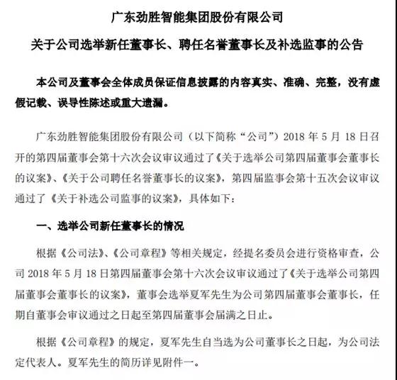 隨后,其發(fā)布《關(guān)于公司選舉新任董事長、聘任名譽(yù)董事長及補(bǔ)選監(jiān)事的公告》,公告內(nèi)容表示,選舉創(chuàng)世紀(jì)董事長夏軍為勁勝智能董事長,聘任王九全為勁勝智能名譽(yù)董事長,選舉王瓊為勁勝智能第四屆監(jiān)事!