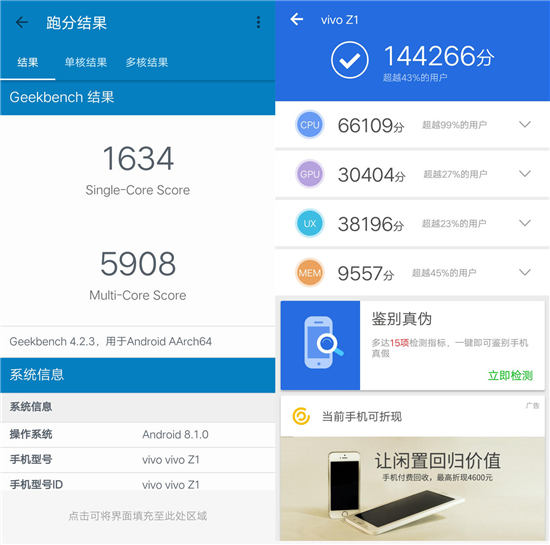 通過GeekBench的跑分,我們看到,vivo Z1的單核跑分為1634分,多核跑分為5908分。這一分?jǐn)?shù)在眾多驍龍660 AIE機(jī)型中也是屬于最頂尖的級(jí)別。同時(shí),vivo Z1在安兔兔的跑分為14萬+,CPU跑分超過99%的用戶。由此可見,vivo Z1在性能上的表現(xiàn)是無需擔(dān)憂的。