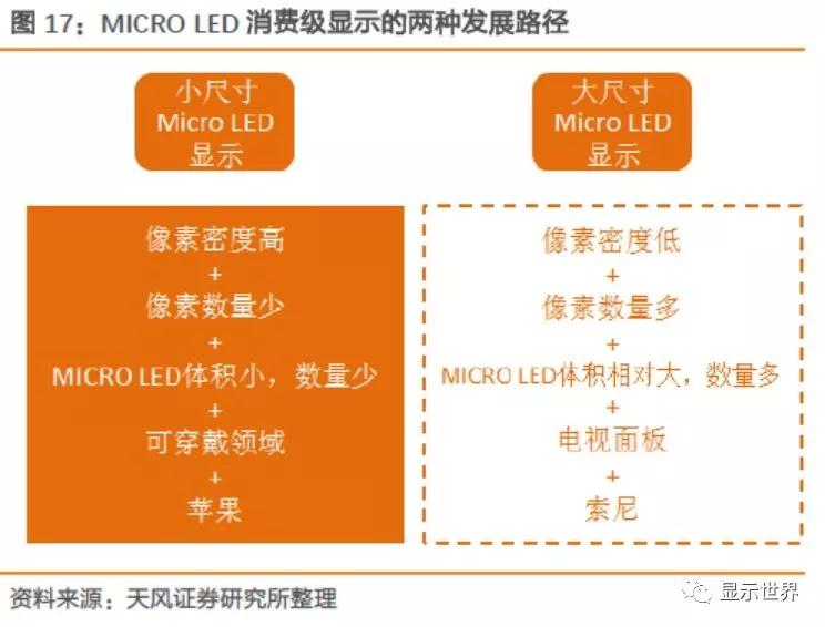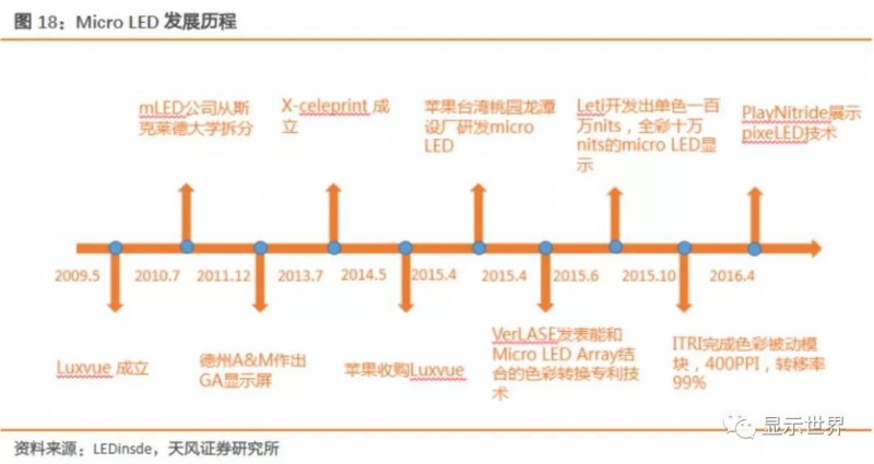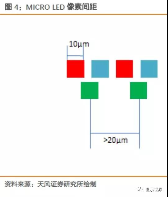 l蘋果瞄準的則是以手表、手機為代表的中小尺寸顯示,其運用到的技術(shù)正是Micro LED技術(shù),即LED的微縮化與矩陣化技術(shù)。為了使LED顯示屏在手機、手表上也保持較高的分辨率,Micro LED燈珠間距需要遠小于小間距屏:Micro LED燈珠間距在1-100μm,其間距是當今最先進的P0.7小間距顯示的1/700-1/7!Micro LED采用的技術(shù)手段也與傳統(tǒng)的小間距LED完全不同,摒棄了傳統(tǒng)的LED芯片封裝->貼合基板->顯示的形式,采用芯片“無封裝”結(jié)構(gòu),通過轉(zhuǎn)移技術(shù)將裸芯片直接連接于基板上。Micro LED概念最早由初創(chuàng)公司luxvue提出,蘋果于2014年5月收購luxvue,并于2015年4月于臺灣龍?zhí)对O(shè)廠研發(fā),完成對Micro LED的技術(shù)儲備。