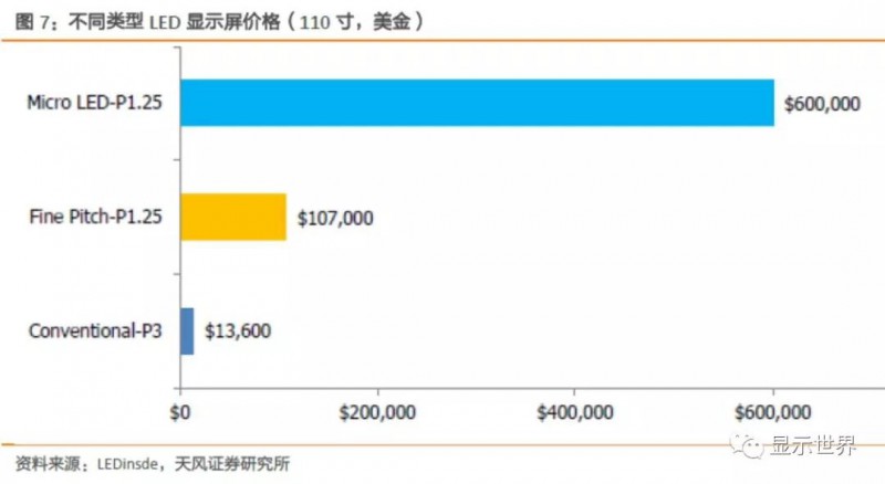 Micro LED價格顯著高于小間距LED,判斷在細分市場先發(fā)力。以索尼CLEDIS顯示屏作為參考,110寸Micro LED顯示大屏價格在60萬美元(等效間距約為1.25mm),而同等間距的小間距LED顯示屏價格約為10.7萬美元(P1.25)。