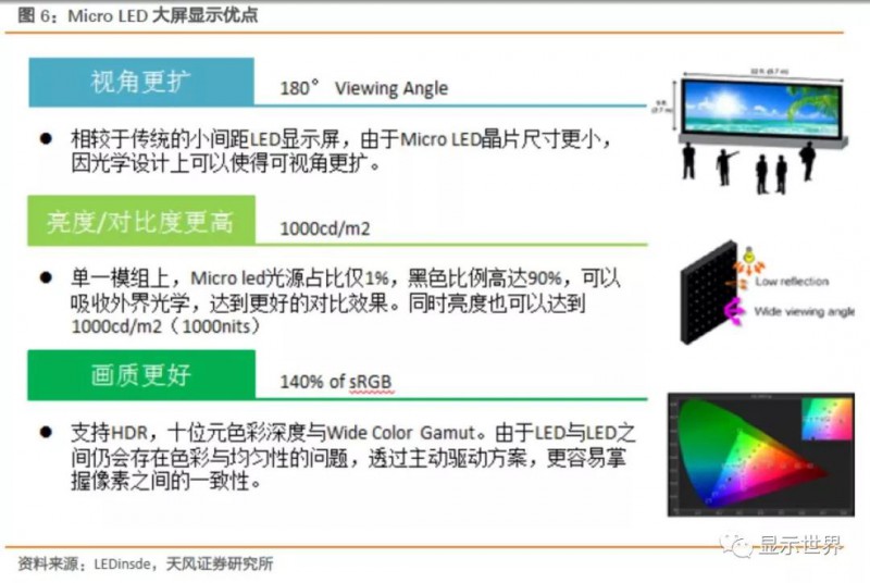 大屏應用中Micro LED主要競爭對手正是同樣定位高端大屏顯示的小間距LED。Micro LED相對小間距LED,除了小間距LED也擁有的無拼縫、高亮度等優(yōu)勢外,還擁有可視角度大、亮度對比度更高、畫質(zhì)更好等優(yōu)勢: