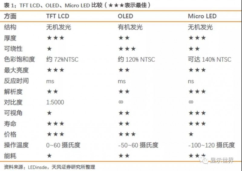 在中小尺寸顯示領(lǐng)域,OLED顯示風頭正旺,大有取代LCD液晶屏之勢,我們判斷OLED之所以能受到各大終端廠商的青睞,正是因為其在反應時間、視角、顯色性、能耗等領(lǐng)域優(yōu)于液晶顯示。而Micro LED在光效、清晰度諸多指標上優(yōu)于OLED,僅從技術(shù)上看完全有機會取代OLED,有望成為繼OLED之后推動顯示質(zhì)量提升的次世代顯示技術(shù)。
