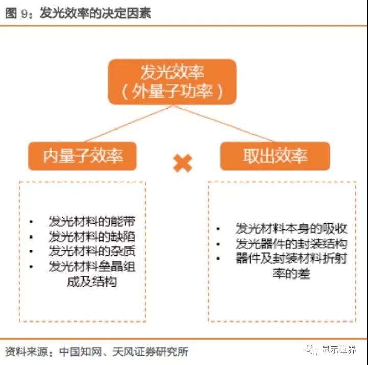 發(fā)光效率又稱為外量子效率,由兩個因素決定:內(nèi)量子效率和取出效率。內(nèi)量子效率是指器件內(nèi)部由復合產(chǎn)生的輻射光子數(shù)與注入器件的電子-空穴對數(shù)之比,取決于發(fā)光材料本身的特性和發(fā)光材料壘晶組成及結(jié)構(gòu);取出效率則指的是發(fā)光器件內(nèi)部產(chǎn)生的光子,在經(jīng)過器件本身的吸收、折射、反射后,實際在器件外部可測量到的光子數(shù)目。