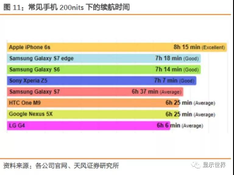 續(xù)航問題是當下手機行業(yè)的一大痛點,提升屏幕質(zhì)量和手機性能等方面都意味著耗費能量的增多。大多手機需要一天一充,從網(wǎng)絡上的評測可見,保持200nits屏幕亮度下,大多手機撐不到10個小時。屏幕耗電占據(jù)整體耗電量可達40%~80%,低功耗技術(shù)可以大大延伸手機使用時間。對于智能手表而言同樣如此,目前蘋果手表續(xù)航也僅有18個小時,誰也不想在運動途中室外手表沒電,提高手表續(xù)航能力符合大眾需求!