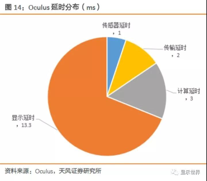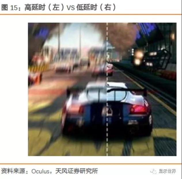 Micro LED在納秒級別的響應速度保證低余暉顯示,降低延時。顯示器上的像素點被點亮的時間為余輝時間,LCD屏由于背光源發(fā)光,像素點在每一幀都是被點亮的,稱為全余暉屏。余暉會導致視覺效果產(chǎn)生拖尾現(xiàn)象,從而使人產(chǎn)生頭暈。為了降低余暉,除了提高刷新率外,就是增加反應速度。VR設(shè)備延時的最主要原因是顯示屏延時,占比達60%以上。Oculus的總延時為19.3ms,其中顯示屏延時為13.3ms。Micro LED響應速度媲美OLED顯示,有望將顯示屏延時降至當前的十分之一。故我們認為Micro LED是應用在VR器件商的優(yōu)異屏幕選擇。