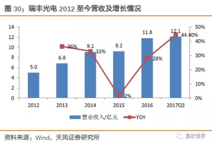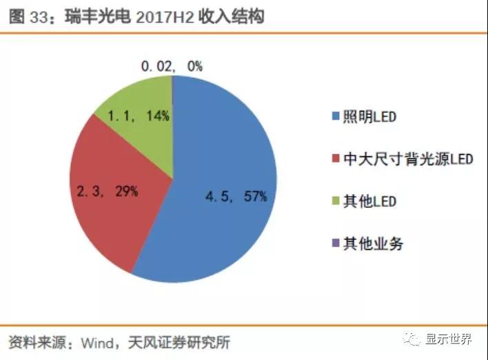 瑞豐光電成立于2000年,專業(yè)從事LED封裝及提供相關(guān)解決方案的國家級高新技術(shù)企業(yè),也是國內(nèi)封裝領(lǐng)域領(lǐng)軍企業(yè),公司2002年建立國內(nèi)第一條SMDLED封裝生產(chǎn)線,是國內(nèi)最早從事SMDLED封裝的企業(yè)之一,是國內(nèi)SMDLED封裝領(lǐng)域的先行者及LED封裝領(lǐng)域的技術(shù)領(lǐng)先者公司。2016年公司營收突破十億元大關(guān),實現(xiàn)營收11.8億元、凈利潤0.5億元;2017年公司業(yè)務仍保持較高增長勢頭。2018年1月31號發(fā)布第1次2017年年報業(yè)績預告,公司業(yè)績預增,預測:凈利潤約12100.95萬元~13600.56萬元,變動幅度為:142%~171.99%。