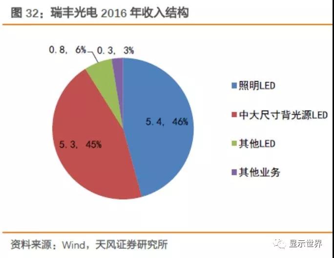 公司專業(yè)從事LED封裝業(yè)務,業(yè)務模式是從上游三安光電等LED芯片供應商采購芯片并按照客戶需求進行定制化設(shè)計和封裝以及產(chǎn)品制造,下游主要包括照明和LCD顯示屏的背光源兩大類。照明和中大尺寸LED背光源占公司主要收入結(jié)構(gòu),2016年照明LED和中大尺寸LED產(chǎn)品收入占比分別為46%和45%,合計超過90%收入貢獻,目前小尺寸LED背光產(chǎn)品收入規(guī)模很小。