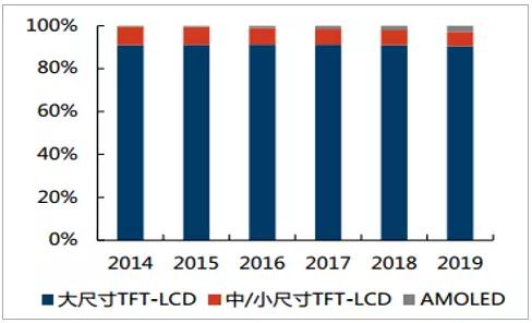 TFT-LCD 帶動偏光片需求增長,大尺寸 TFT-LCD 用偏光片仍是主流。 偏光片是 TFT-LCD 成像不可或缺的組件,其市場需求的增長主要由 TFT-LCD 的需求主導(dǎo),全球偏光片市場需求面積有望在 2019 年達到 5億平方米,其中,大尺寸 TFT-LCD 仍是偏光片需求主要來源,貢獻 80%以上的需求。