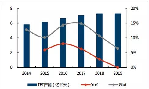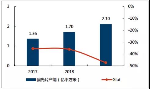 緊跟需求,全球偏光片產(chǎn)能穩(wěn)步提升,供需結(jié)構(gòu)相對穩(wěn)定。 在市場需求的帶動下,全球偏光片產(chǎn)能逐步提升,據(jù)預(yù)測, 2019 年全球偏光片產(chǎn)能有望達到 7.28億平方米, 同時, Glut 值((供給-需求) /需求)為 6.4%,供給略高于需求,供需結(jié)構(gòu)較為良好。