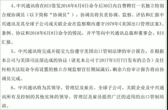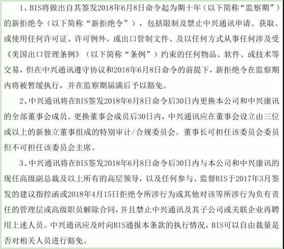 在中興通訊根據(jù)協(xié)議和2018年6月8日命令及時全額支付10億美元及(2)將額外的4億美元支付至美國銀行托管賬戶后,BIS將終止其于2018年4月15日(美國時間)激活的拒絕令(以下簡稱“2018年4月15日拒絕令”)并將中興通訊從《禁止出口人員清單》中移除。如果上述條件均滿足且中興通訊已從《禁止出口人員清單》中移除,BIS將對外公布。