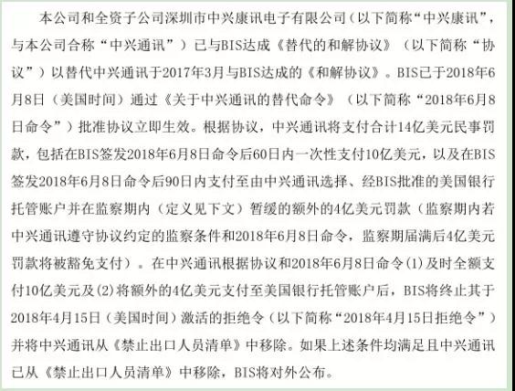 而到了6月12日,中興通訊在A股、港股同時發(fā)布公告,稱公司已與BIS達(dá)成《替代的和解協(xié)議》。根據(jù)協(xié)議,所有罰款全部到賬后,BIS才將終止激活拒絕令,并將中興通訊從《禁止出口人員清單》中移除。