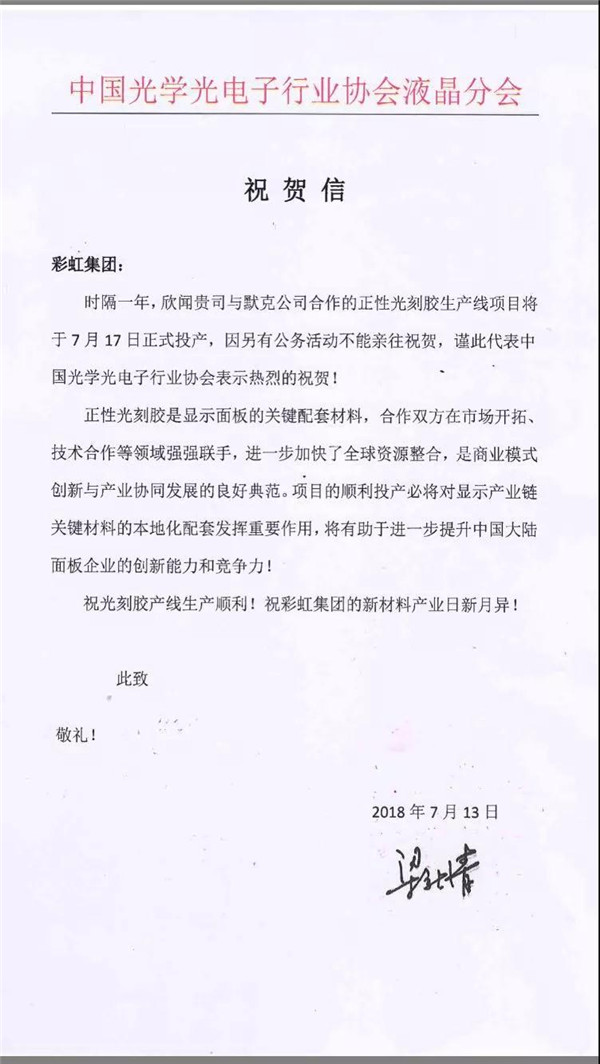 中國(guó)光電子協(xié)會(huì)液晶分會(huì)秘書長(zhǎng)梁新清向彩虹正性光刻膠投產(chǎn)發(fā)來賀信