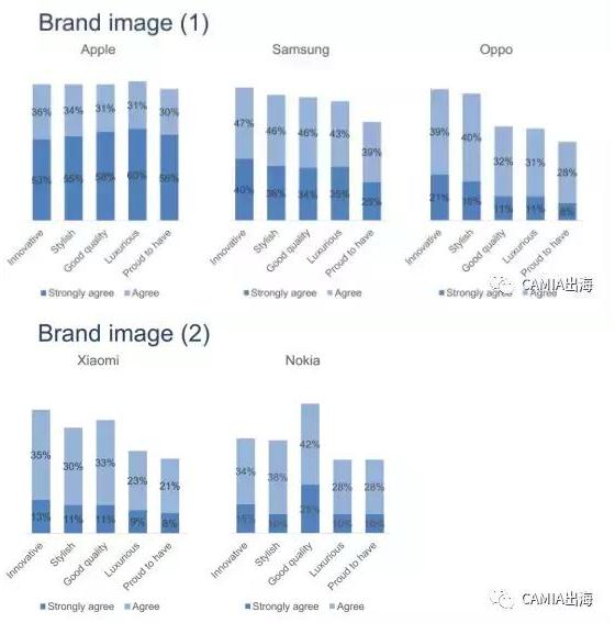 在品牌形象方面,三星深受年齡層30-40歲的男性歡迎,蘋果給人的印象是高大上,OPPO在創(chuàng)意和時(shí)尚方面高于其他的項(xiàng)目,不少人對(duì)于諾基亞的第一反應(yīng)是質(zhì)量不錯(cuò),看來(lái)諾基亞以前能砸核桃的傳聞一直被人相信。