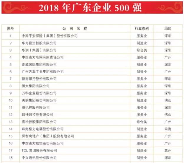 2018廣東制造業(yè)百強(qiáng)/企業(yè)500強(qiáng)名單