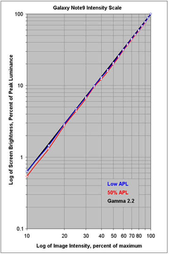 經(jīng)過測(cè)量結(jié)果顯示,在關(guān)閉自動(dòng)亮度,而且亮度滑塊手動(dòng)設(shè)置為最大的情況下,Galaxy Note 9基于不同模式和APL下的亮度為363 cd/m²至544 cd/m²(尼特)。