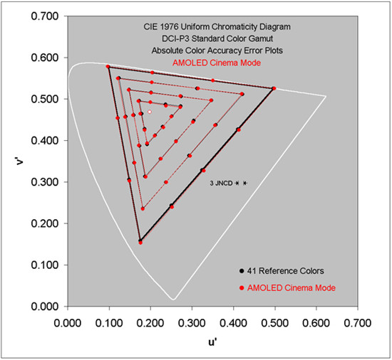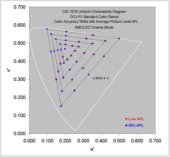 AMOLED電影屏幕模式(DCI-P3色域)下,圖像從低APL到50%高APL變化,平均色差僅為0.7 JNCD,最高色差為1.5JNCD: