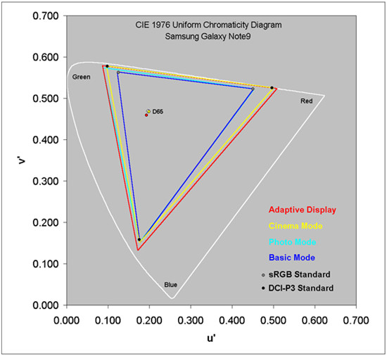 再來說說Galaxy Note 9默認(rèn)的自適應(yīng)顯示模式,在此模式下,屏幕能夠動(dòng)態(tài)調(diào)整圖像和視頻顯示效果,根據(jù)內(nèi)容和周圍環(huán)境光照明情況提供最適用于某些應(yīng)用的顏色。D65帶白點(diǎn)、色域、顏色飽和度與環(huán)境光傳感器在其中均會(huì)動(dòng)態(tài)調(diào)整。DisplayMate提到,自適應(yīng)顯示模式提供了更高色彩飽和度,色域比常規(guī)sRGB/Rec.709大142%,比DCI-P3大113%。